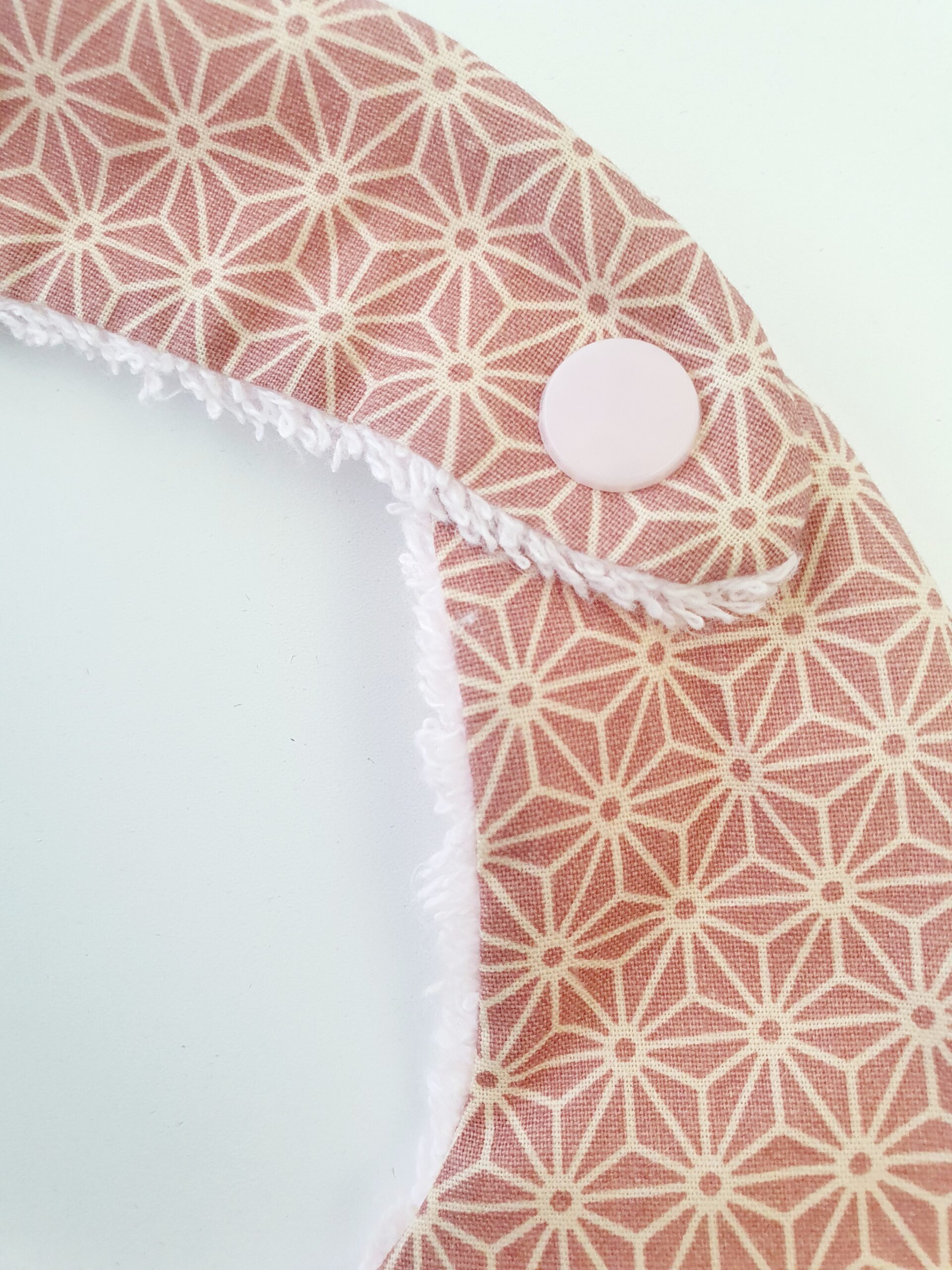 Matières : Coton 100% fond vieux rose motifs Asanoha beige Oeko-tex / Eponge rose poudre Oeko-tex / Etiquette My Minus en satin / Ruban satin rose / Pression rose