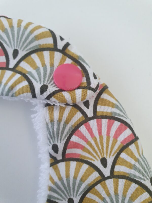 Matières : Coton 100% fond blanc motifs éventails rose et or Oeko-tex / Eponge blanche Oeko-tex / Etiquette My Minus en satin / Ruban satin vieux rose / Pression fuchsia