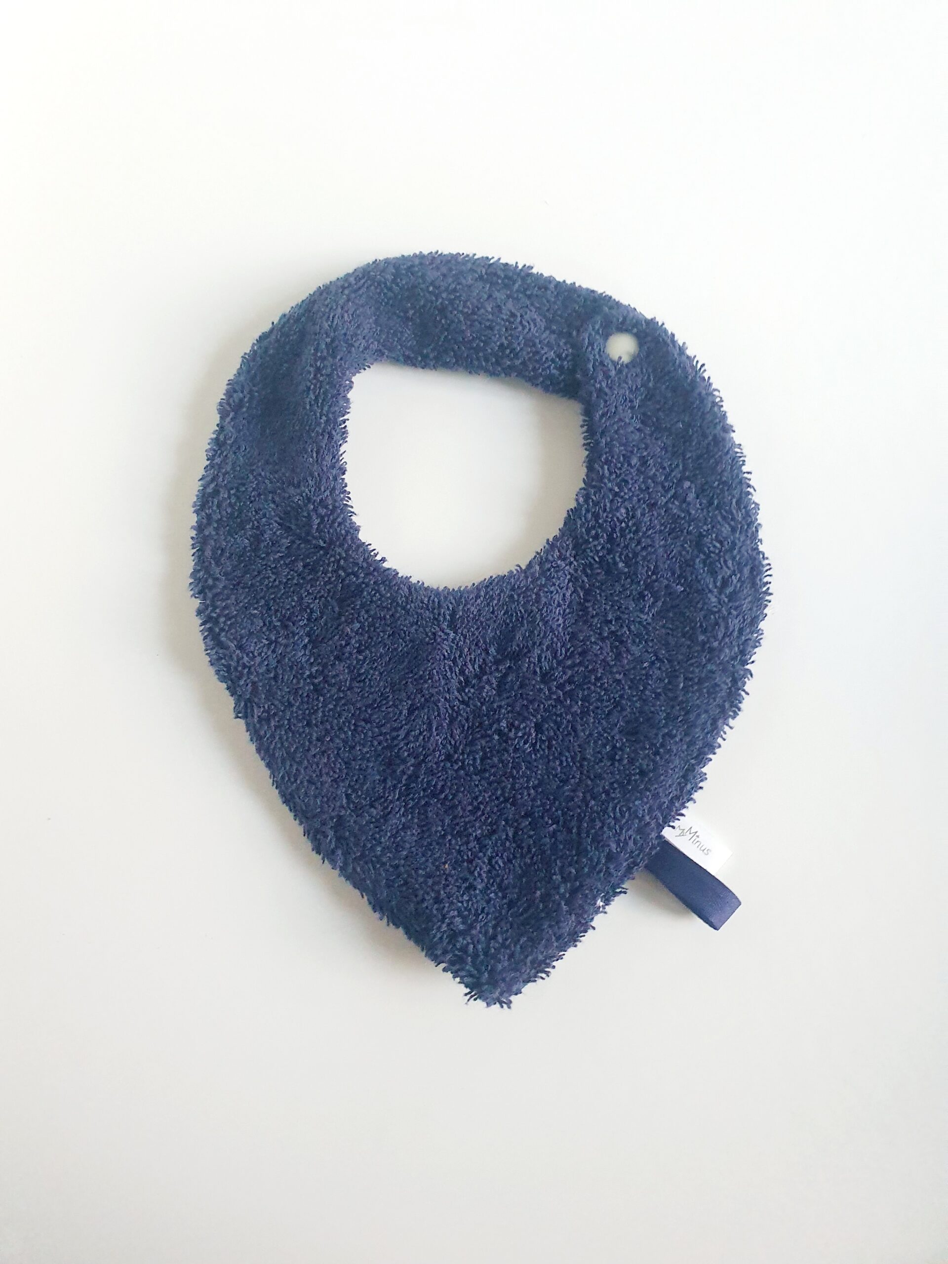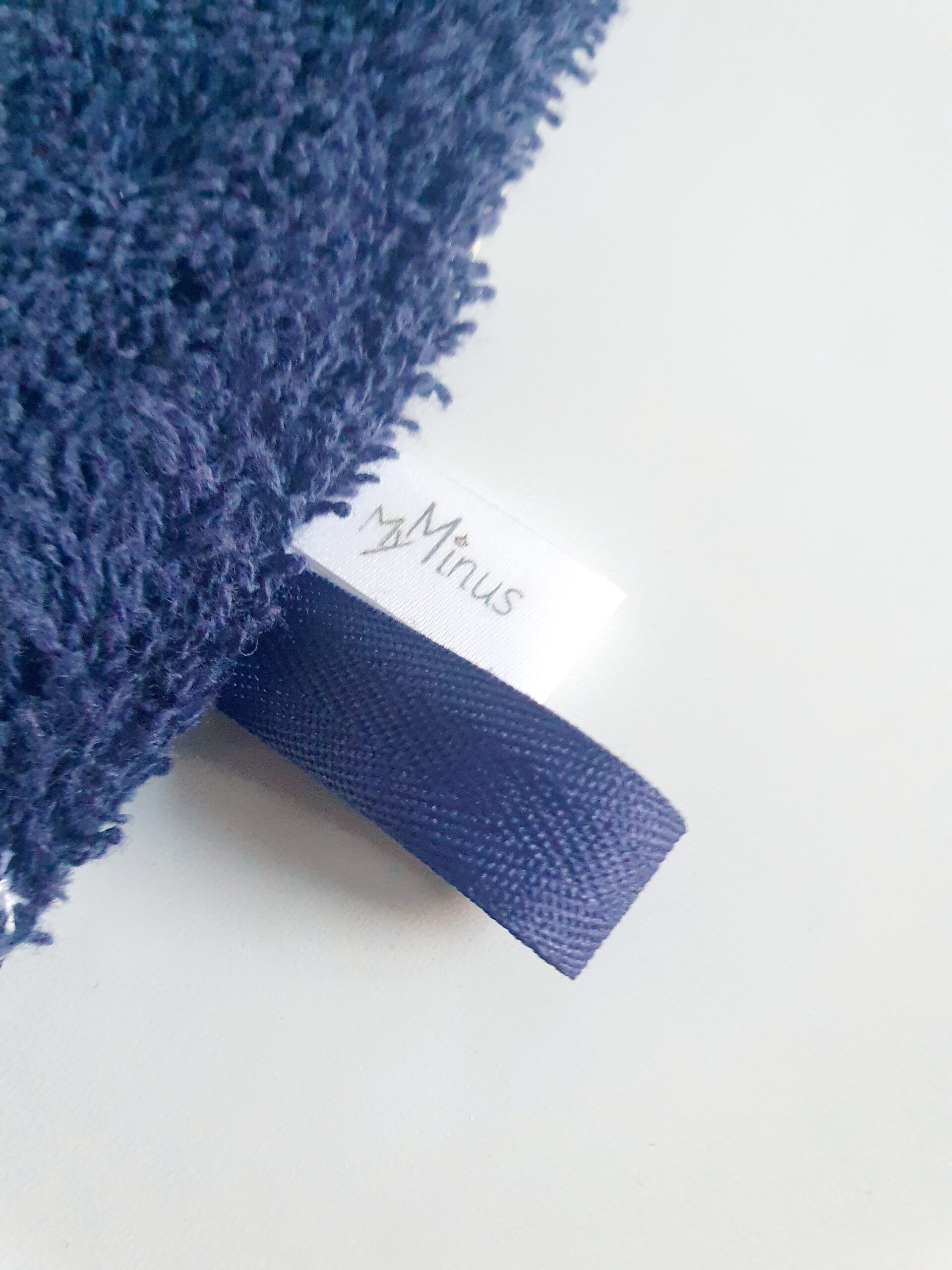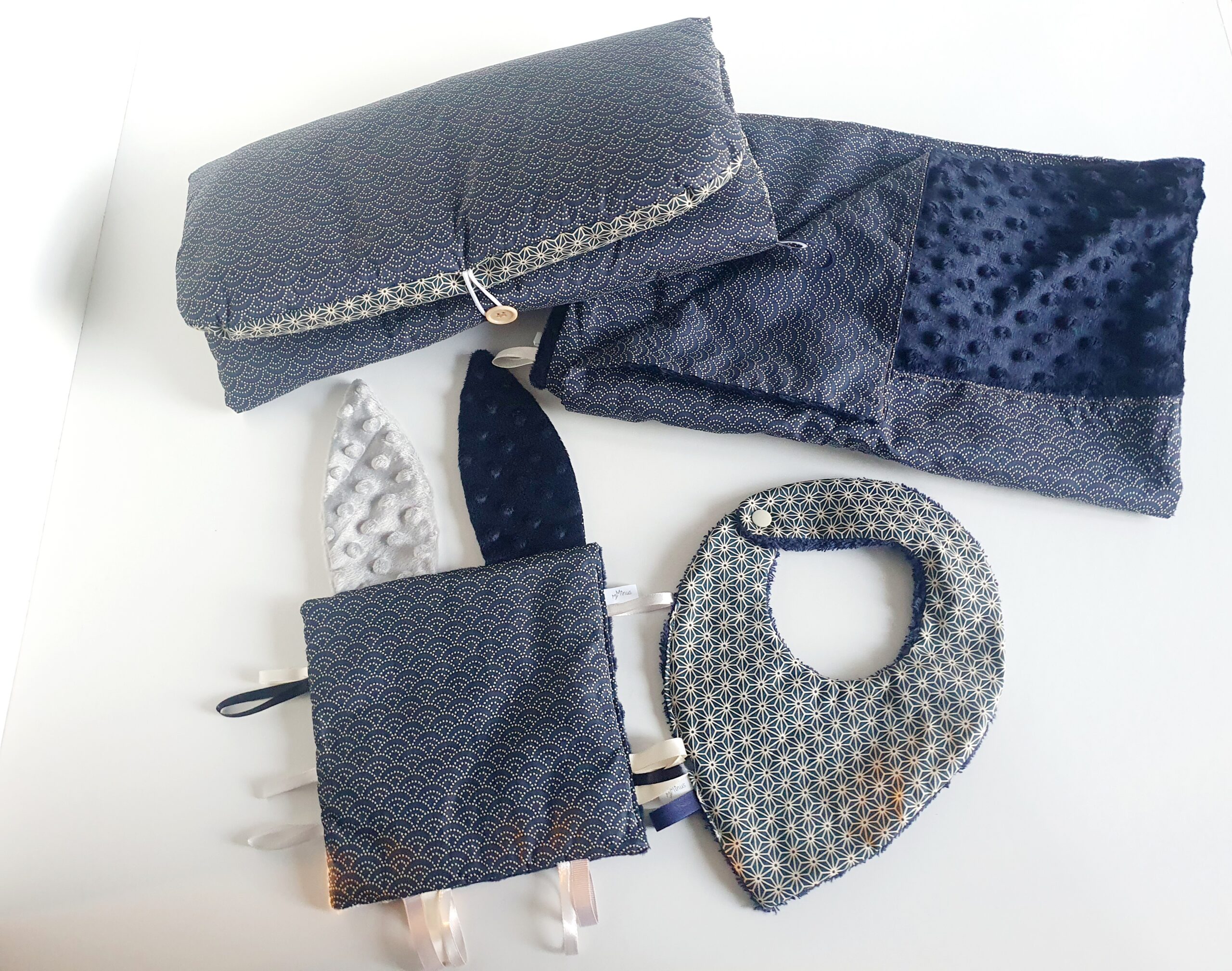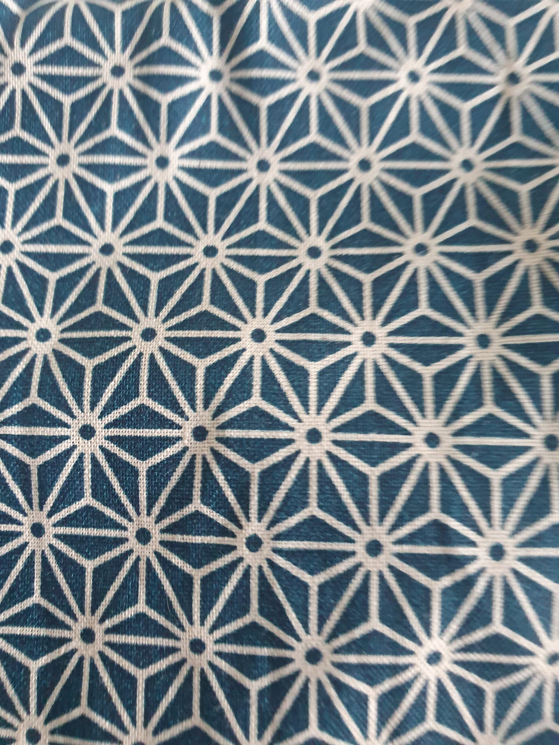 Matières : Coton 100% fond bleu marine motifs Asanoha Oeko-tex / Eponge bleu marine Oeko-tex / Etiquette My Minus en satin / Ruban gros grain bleu marine/ Pression beige