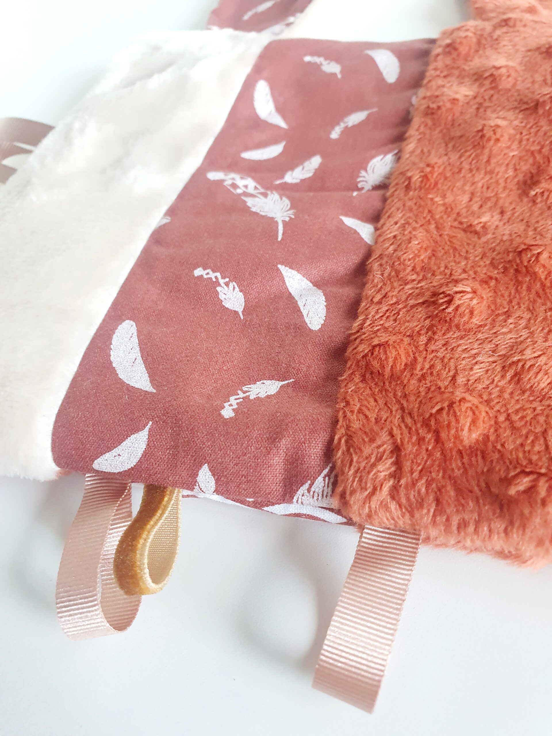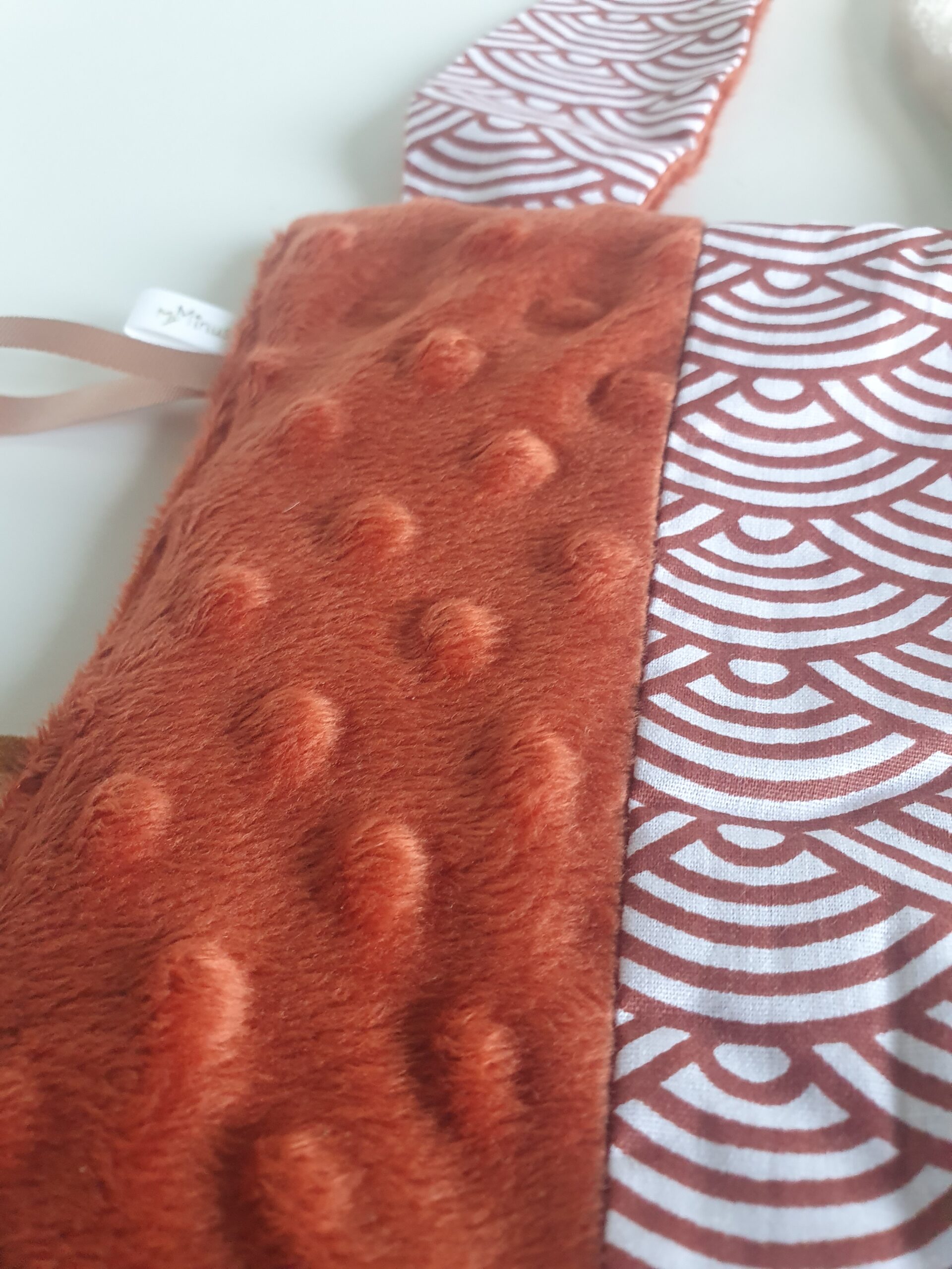 Matières : Tissu 100 % coton motifs Asonoha terracotta Oeko-Tex /Tissu 100 % coton motifs plumes terracotta Oeko-Tex/ Tissu minky pois terracotta Oeko-Tex / Tissu douillette beige Oeko-Tex /étiquette en satin My Minus/ rubans satin beige /rubans gros grain Camel /rubans velours Camel / Molleton Oeko-Tex pour le corps du doudou.
