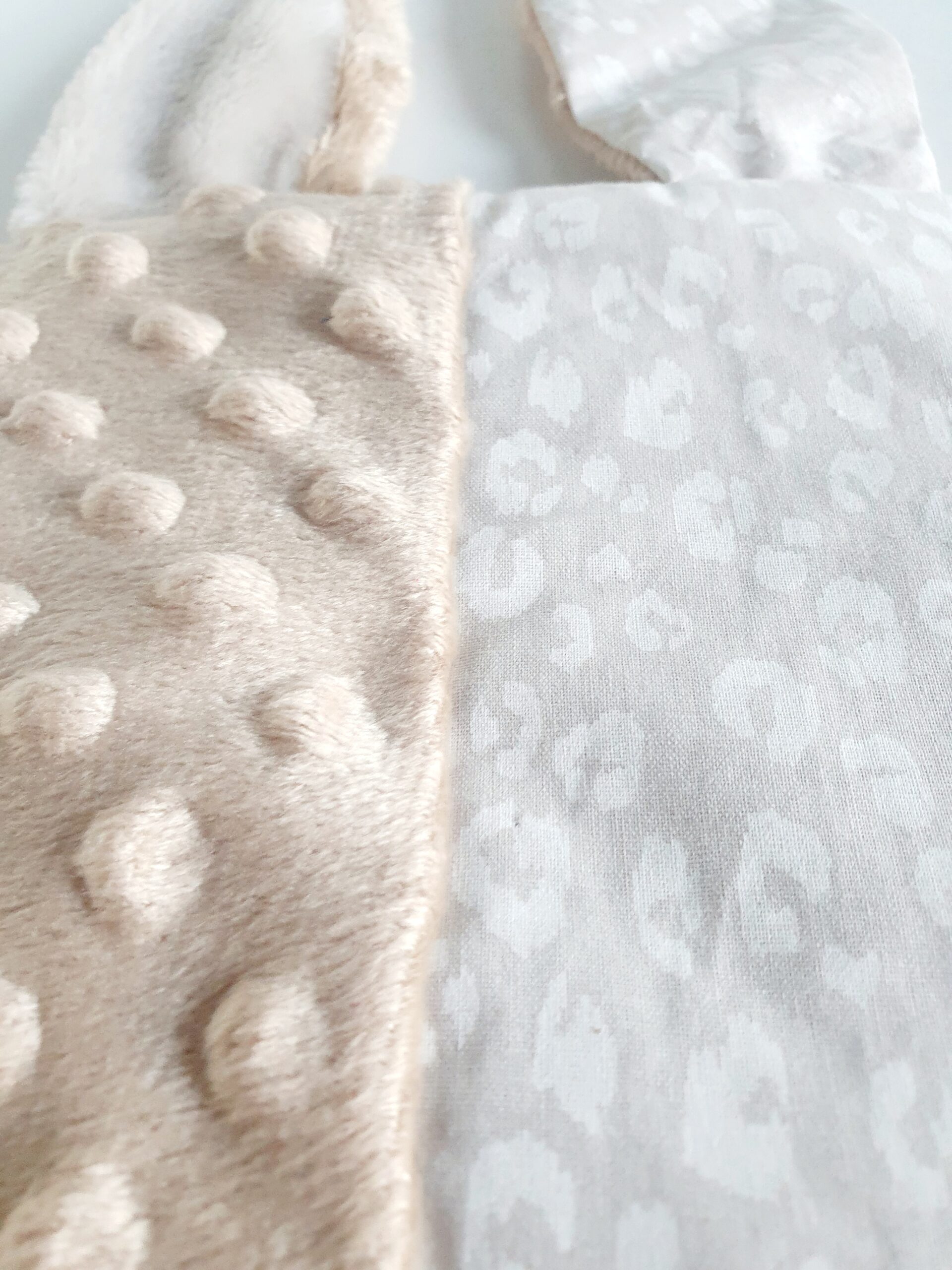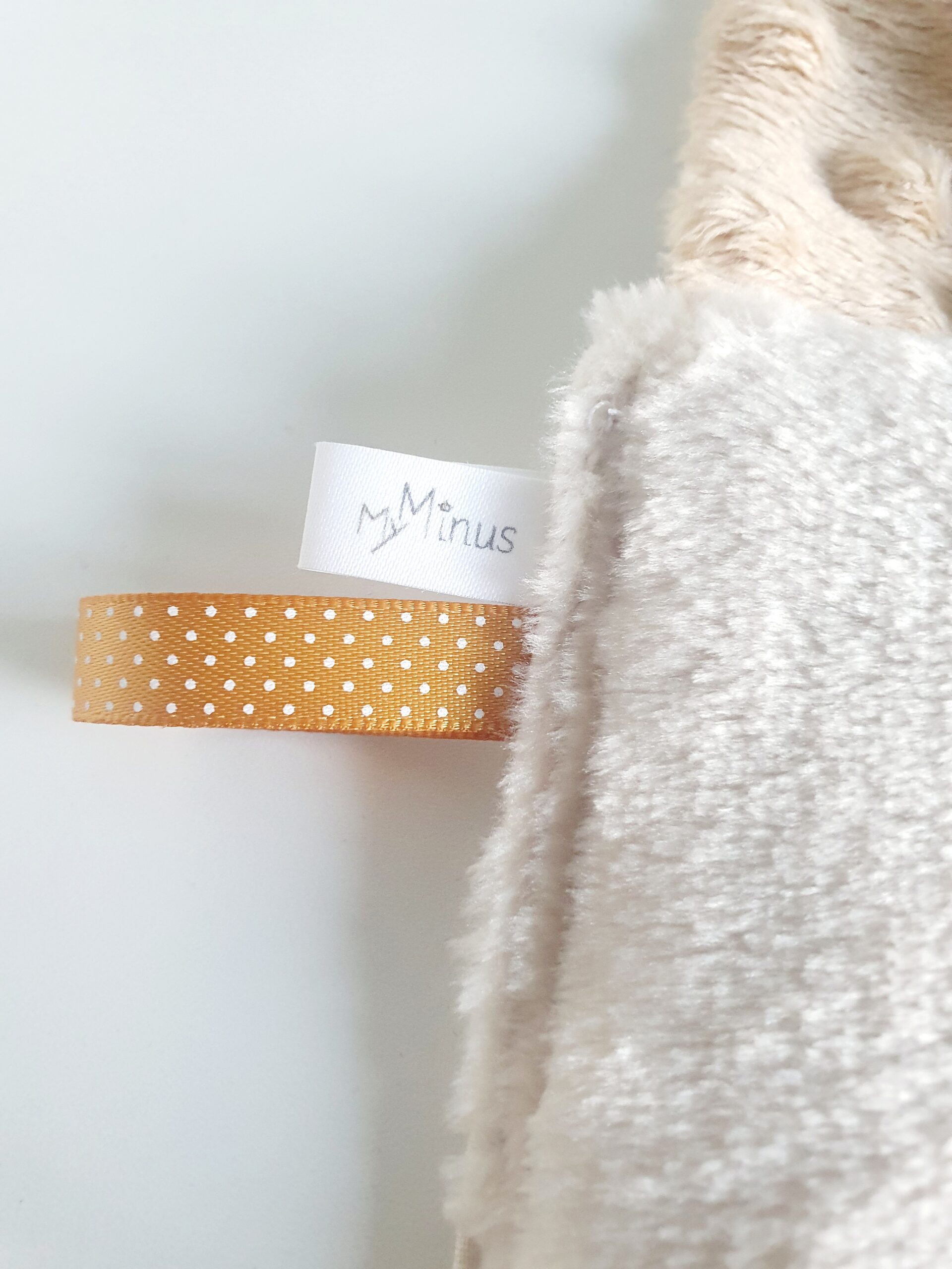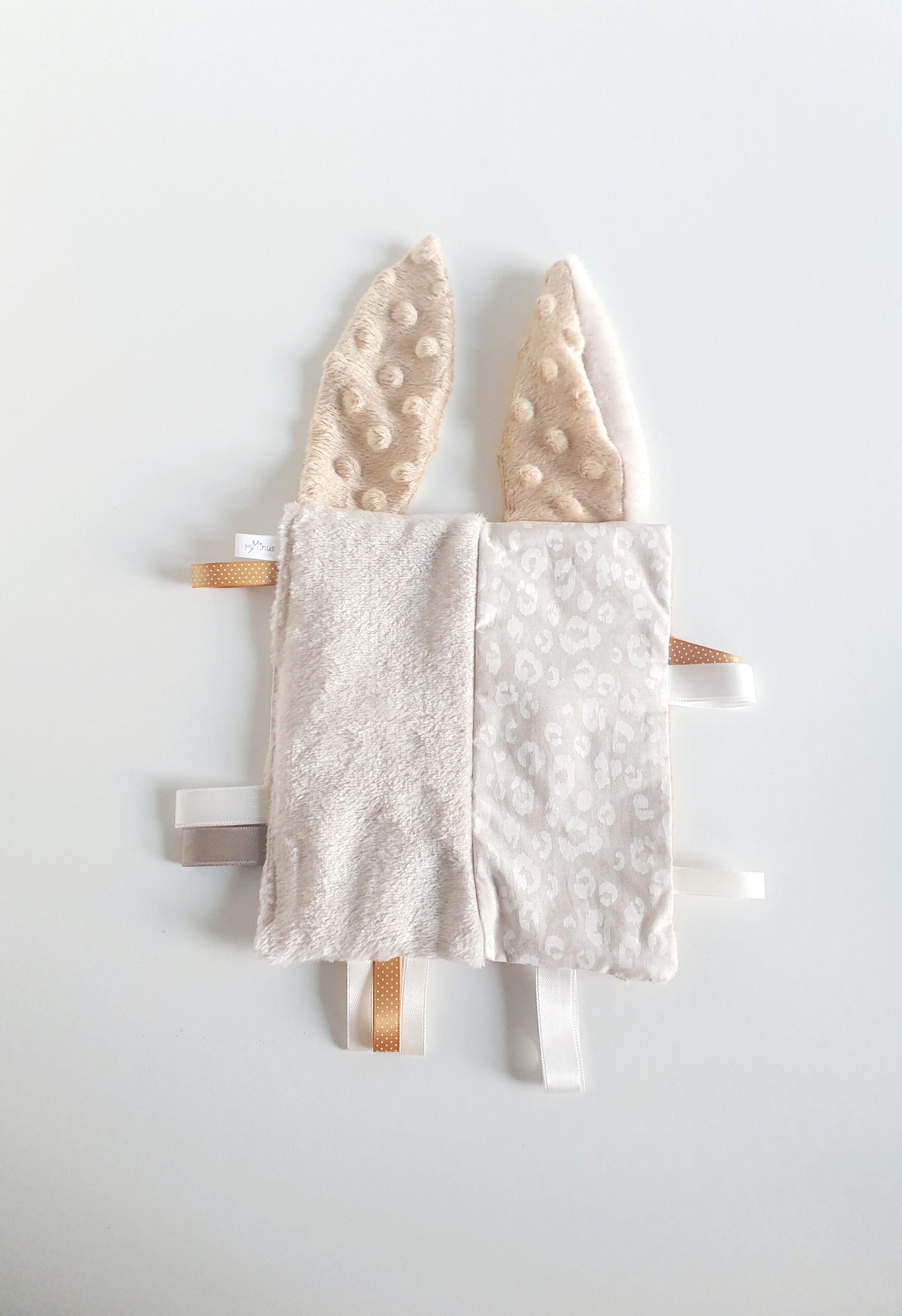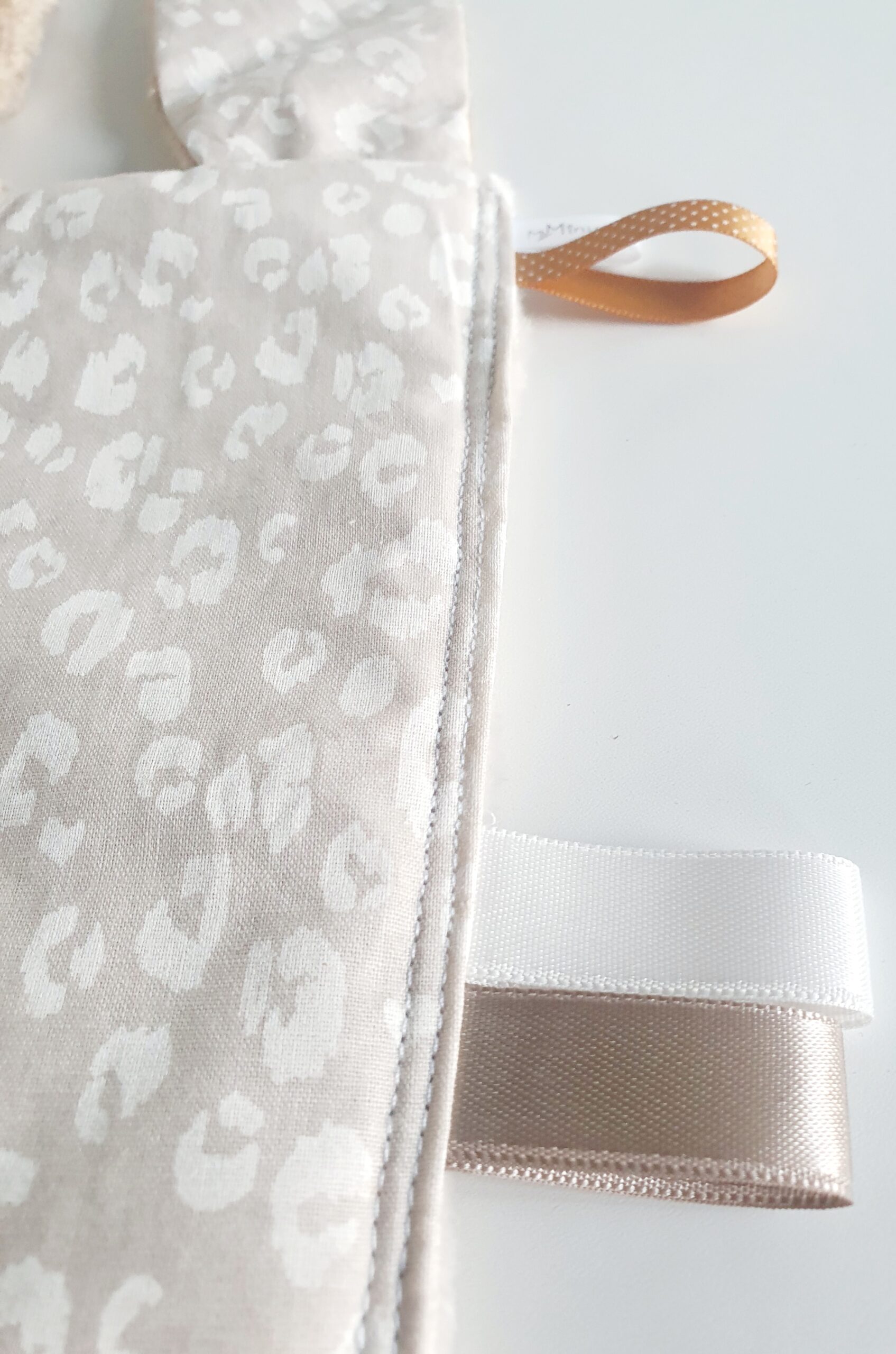 Matières : Tissu 100 % coton beige motifs taches léopard blanches Oeko-Tex /Tissu minky a pois café Oeko-Tex/ Tissu minky lisse beige Oeko-Tex /étiquette en satin My Minus/ rubans satin blanc, beige et café /rubans satin caramel à pois/ Molleton Oeko-Tex pour le corps du doudou.