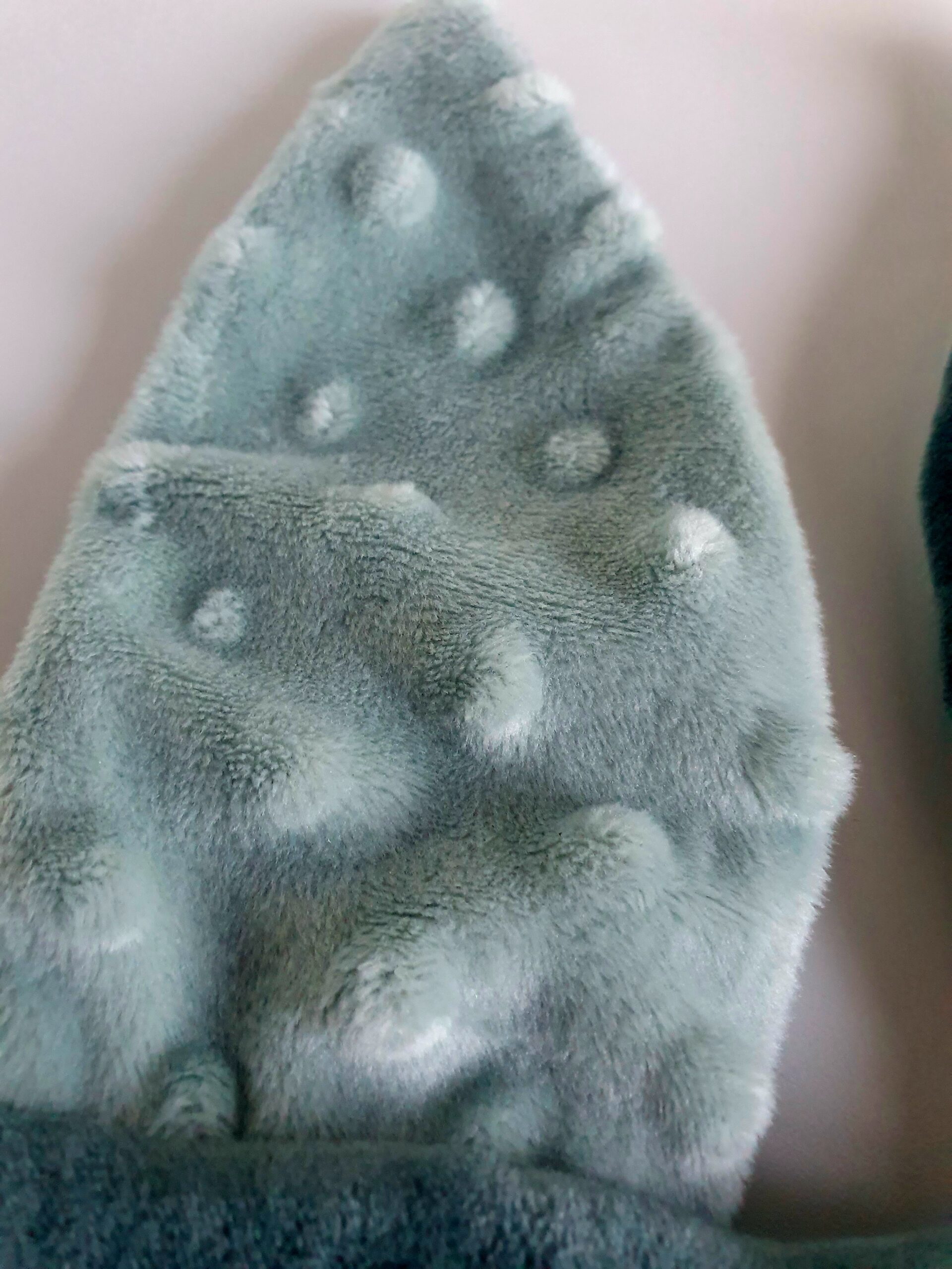 Matières : Tissu jersey coton violet vert amande à pois touché velours Oeko-Tex /Tissu minky pois vert amande/étiquette en satin My Minus/ rubans satin beige ,saumon et rose /rubans satin vert amande ,blanc et vert /ruban gros grain turquoise à pois /Molleton Oeko-Tex pour le corps du doudou.