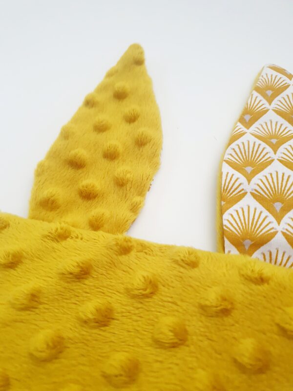 Matières : Tissu coton jaune moutarde motifs paon Oeko-Tex / Tissu minky jaune moutarde Oeko-Tex/ étiquette en satin My Minus/ rubans satin blanc, caramel /ruban velours jaune moutarde / Ruban voile blanc / Molleton Oeko-Tex pour le corps du doudou