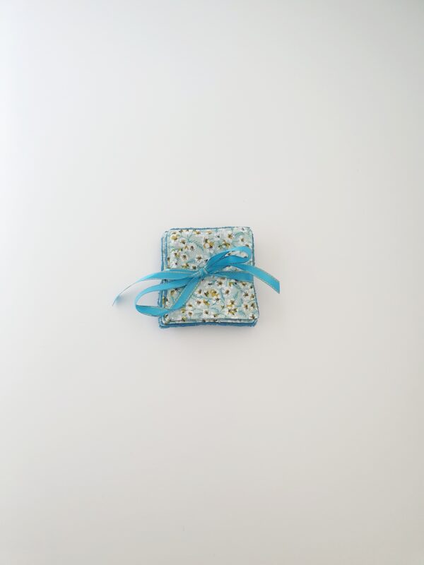 Matières : Coton 100% turquoise motifs cerisier Oeko -Tex / Eponge Bambou bleu canard Oeko -tex / Ruban satin bleu canard et doré pour fermer le lot de 6 lingettes