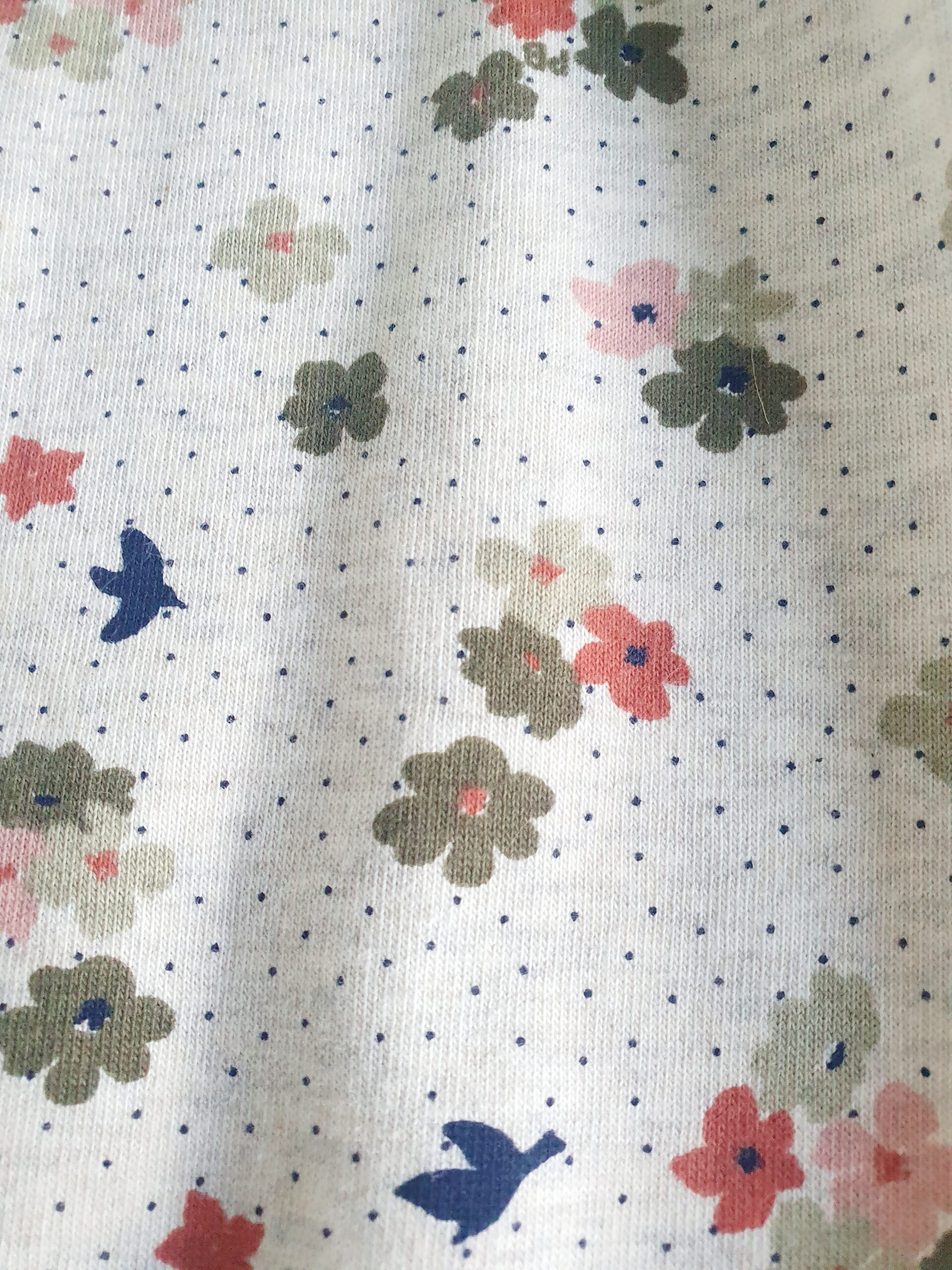 Matières: Jersey motifs fleuris et petits oiseaux et pois Oeko -Tex/Bord côte vert amande Oeko-tex / Etiquette My Minus en satin