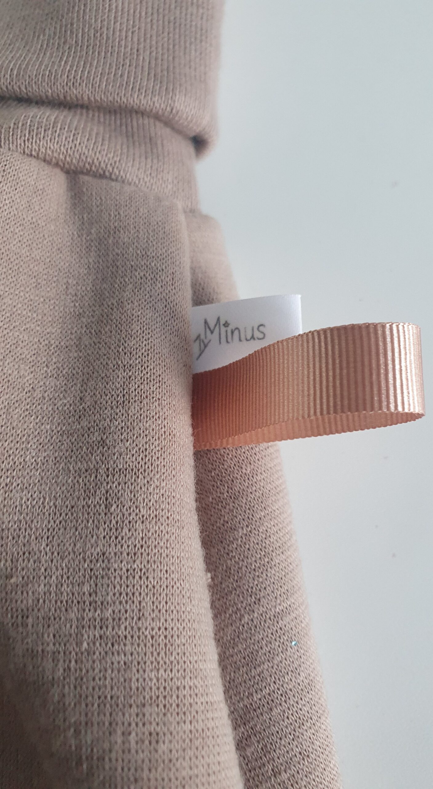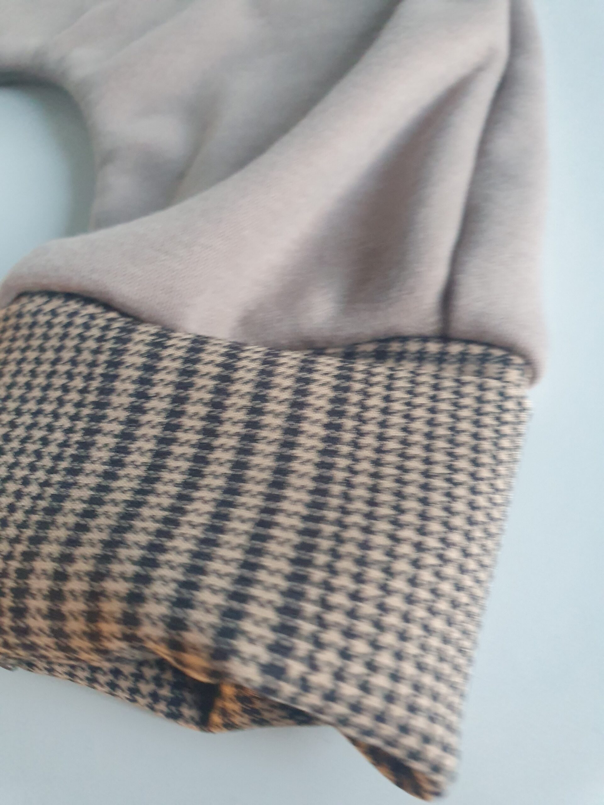 Matières: Jersey couleur taupe molletonnée Oeko -Tex/ Jersey carreaux noir et taupe Oeko-tex /Bord côte taupe Oeko-tex / Etiquette My Minus en satin / Ruban gros grain  caramel