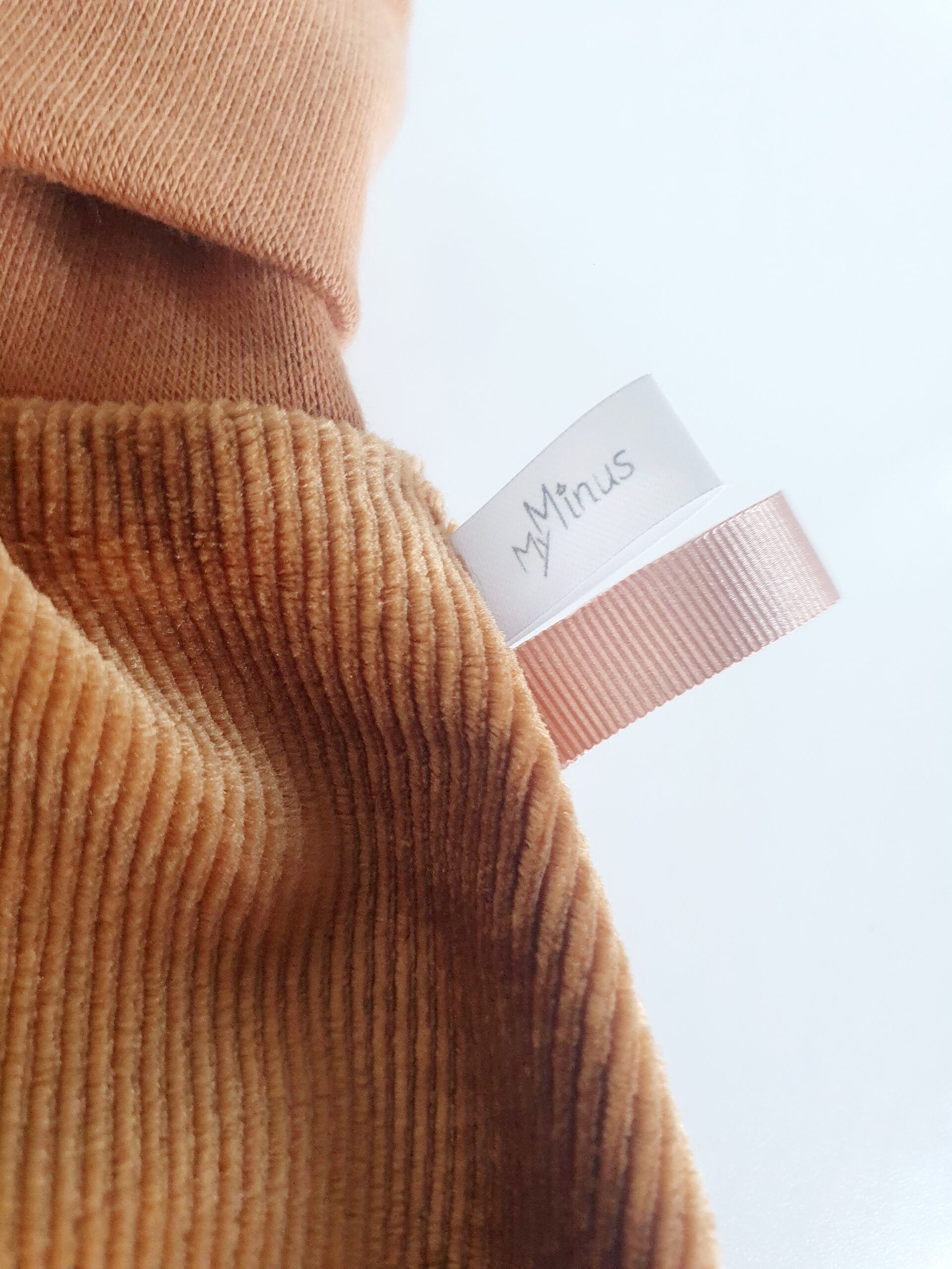 Matières : jersey souple velours caramel Oeko-tex / bord côte caramel Oeko-tex/ruban gros grain caramel/étiquette en satin My Minus