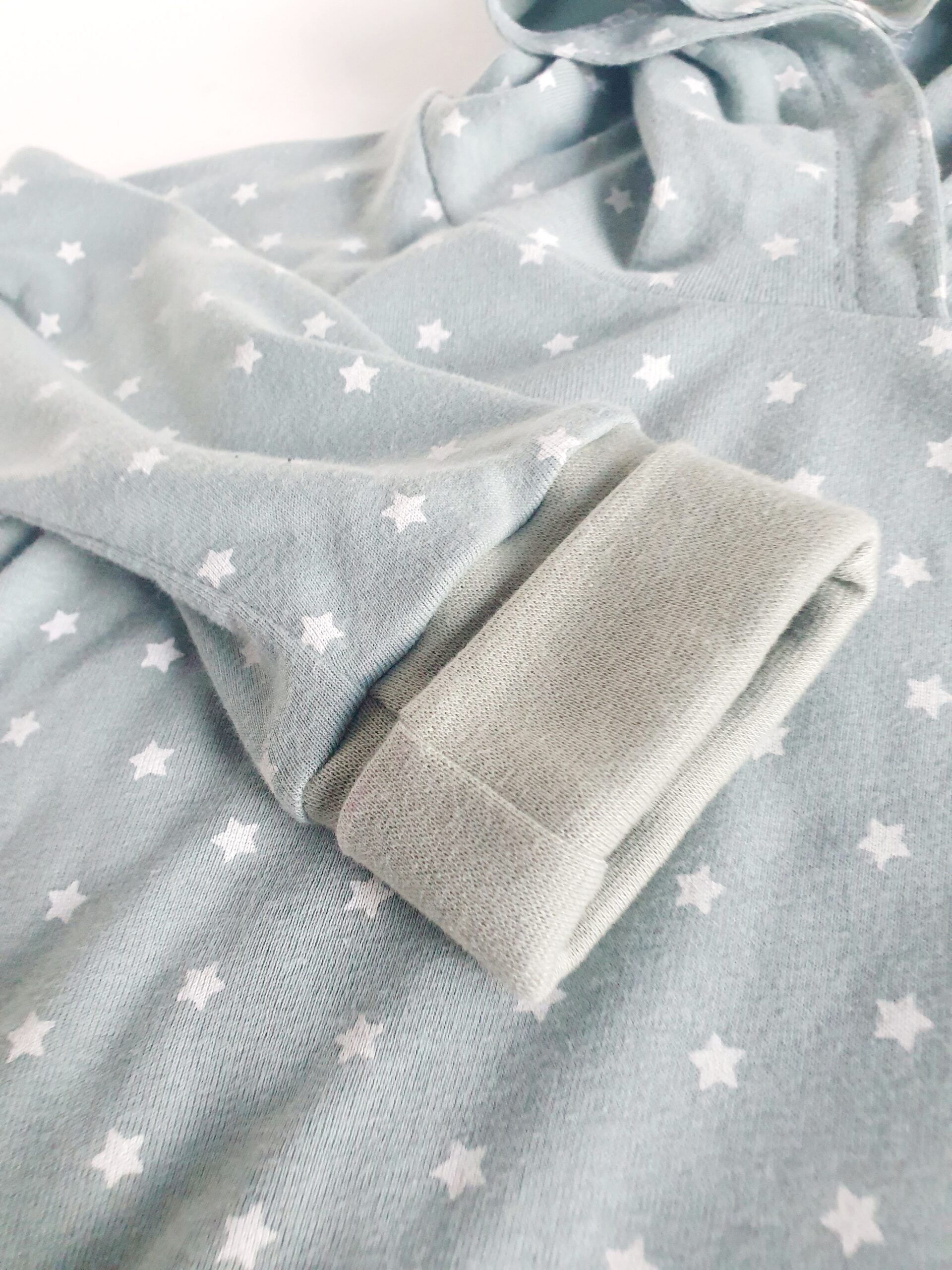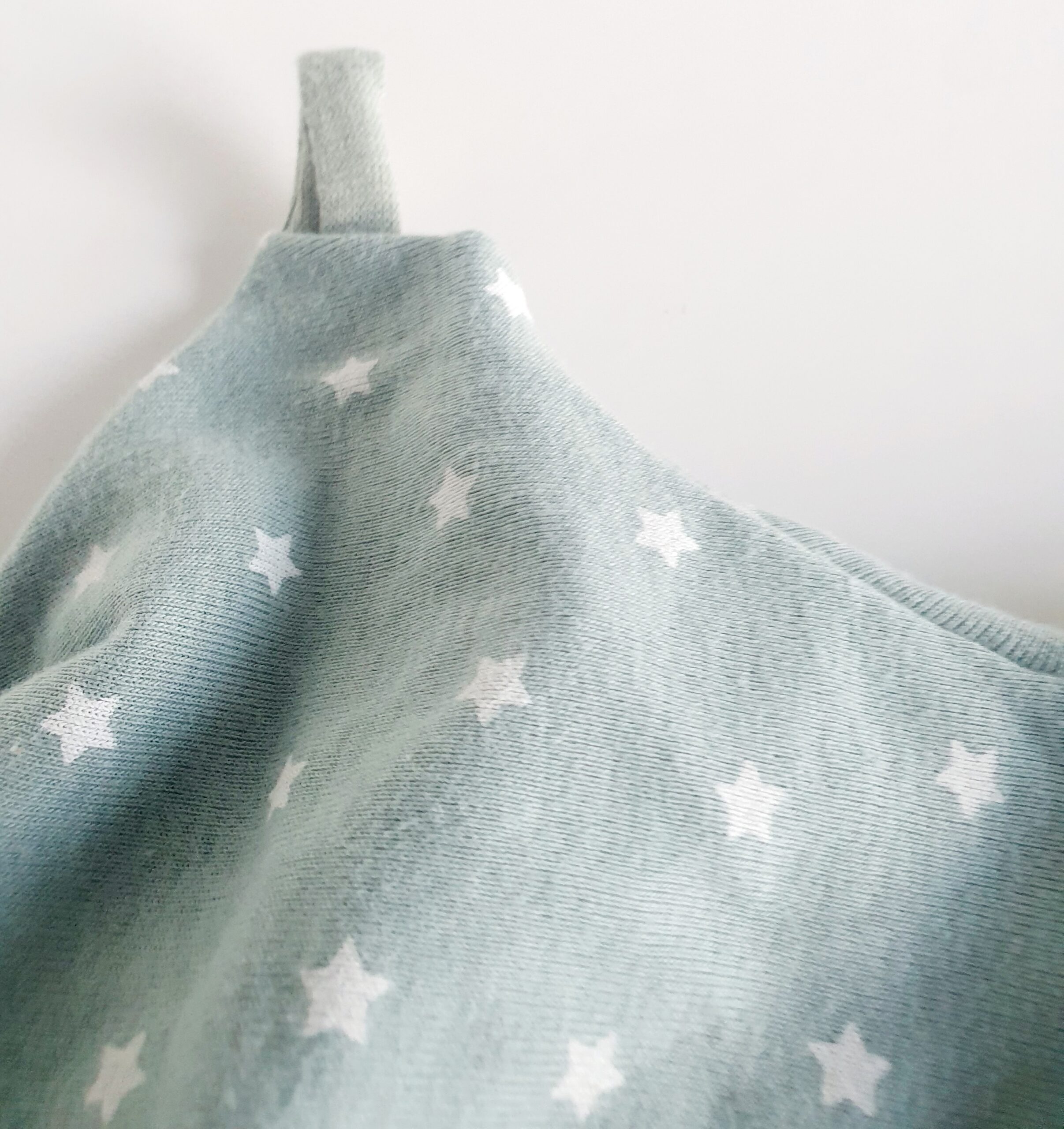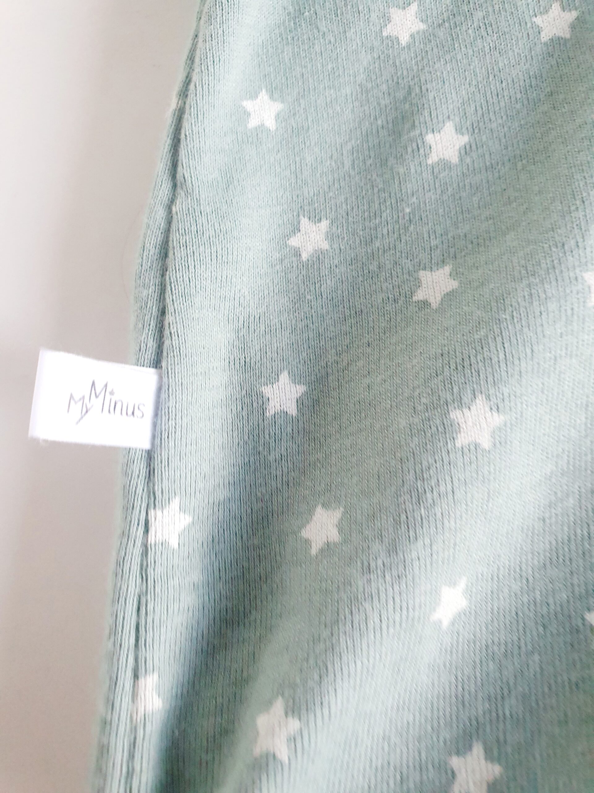 Matière : Jersey léger vert amande motifs étoiles blanches Oeko -Tex/ bord côte vert amande Oeko-tex /  Etiquette My Minus en satin