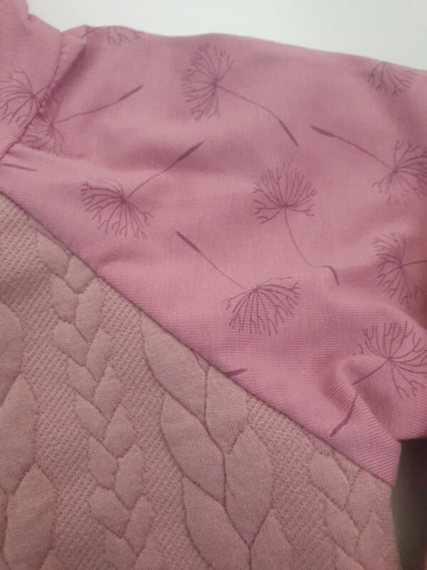 Matières : Jersey vieux rose torsade en reliefs Oeko -Tex/ jersey vieux rose motifs pissenlit Oeko-tex /Bord vieux rose Oeko-tex / Etiquette My Minus en satin / Ruban satin vert amande